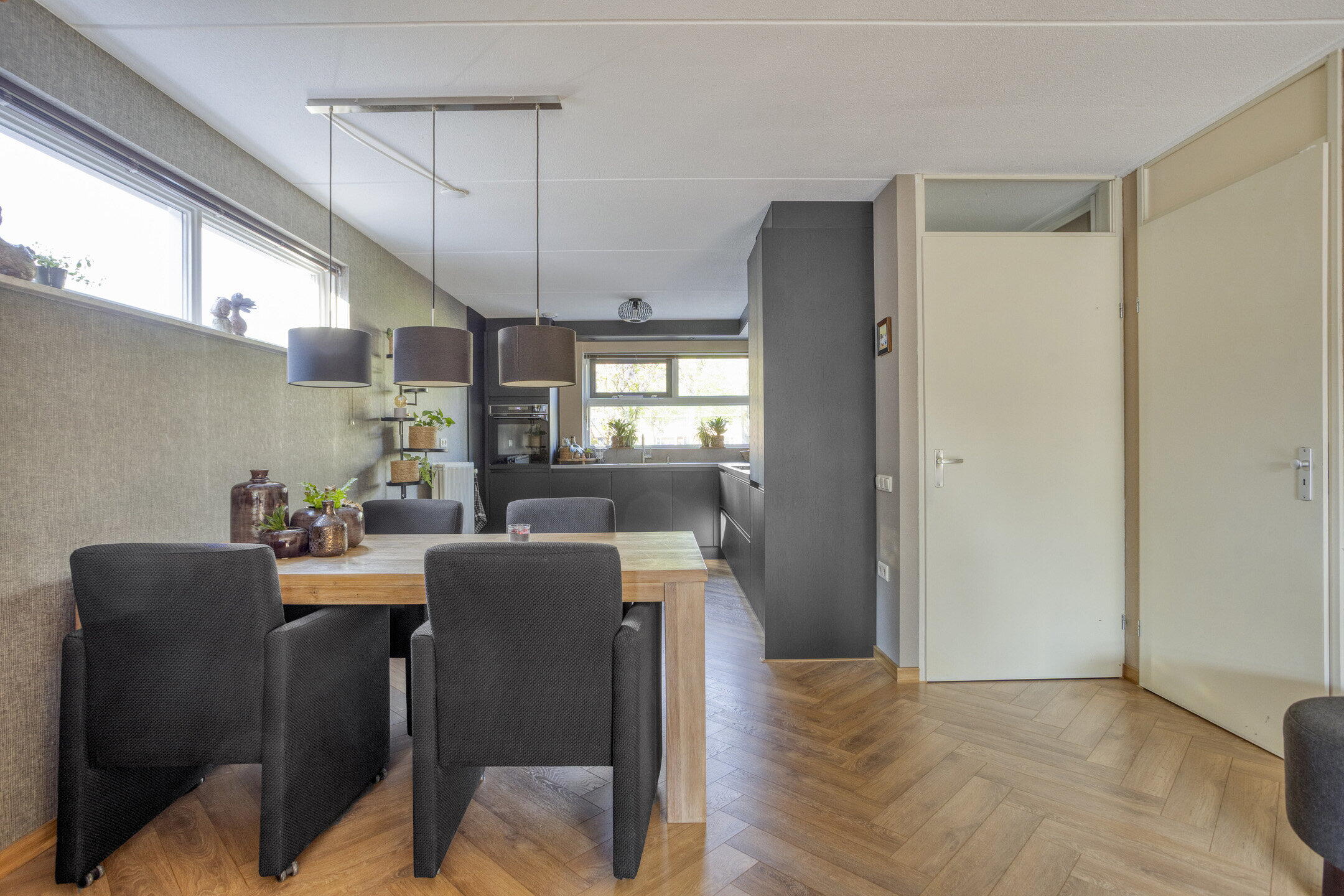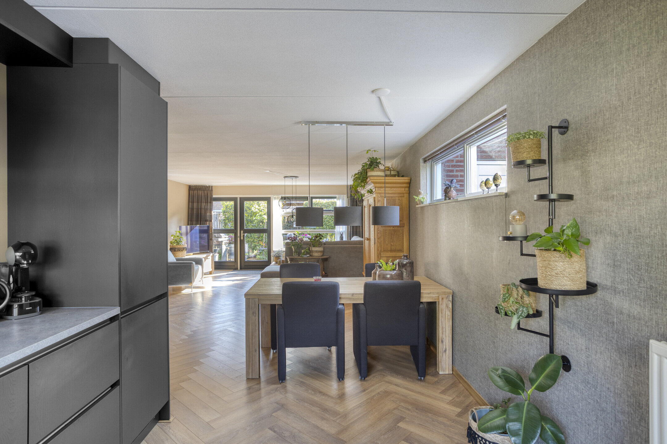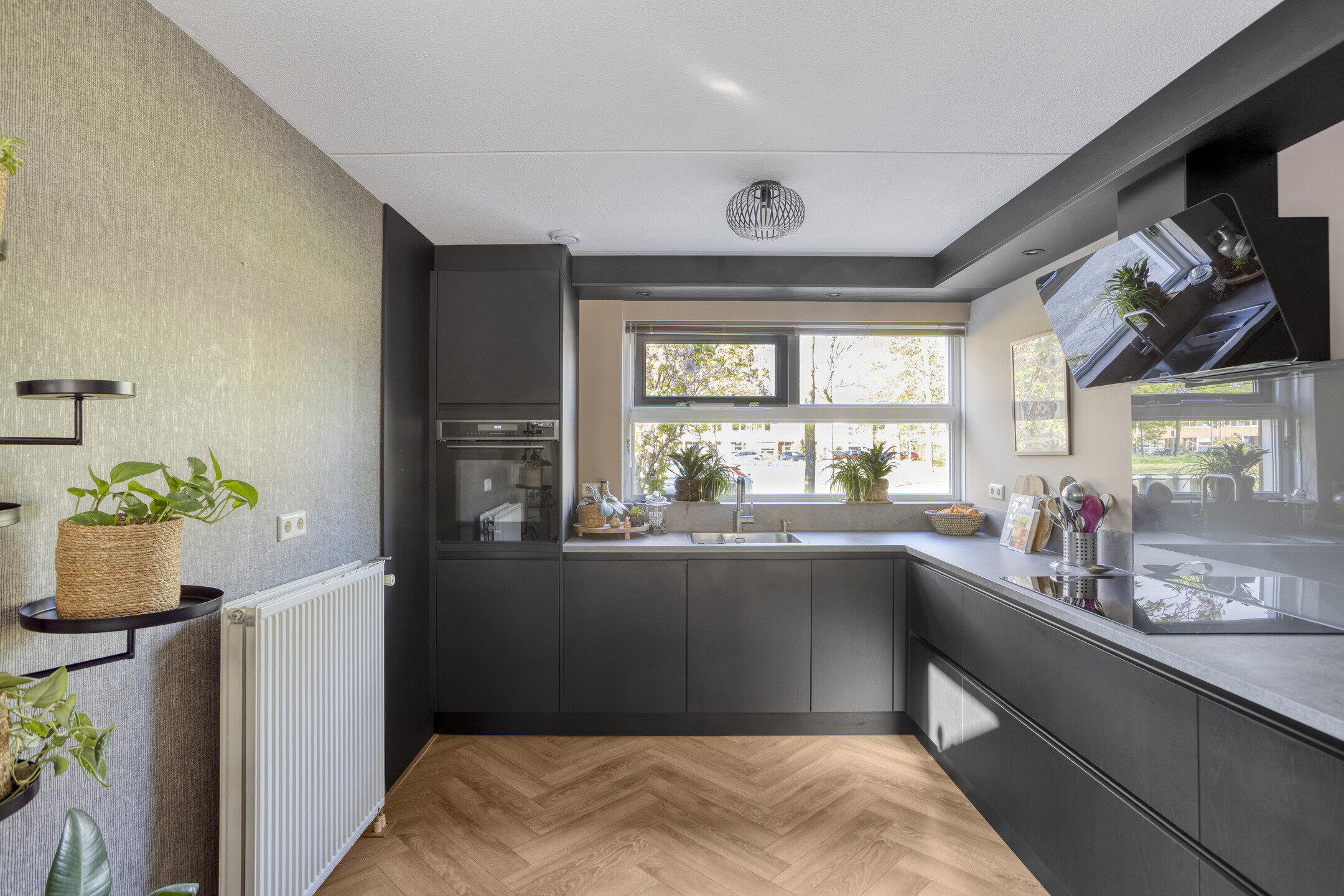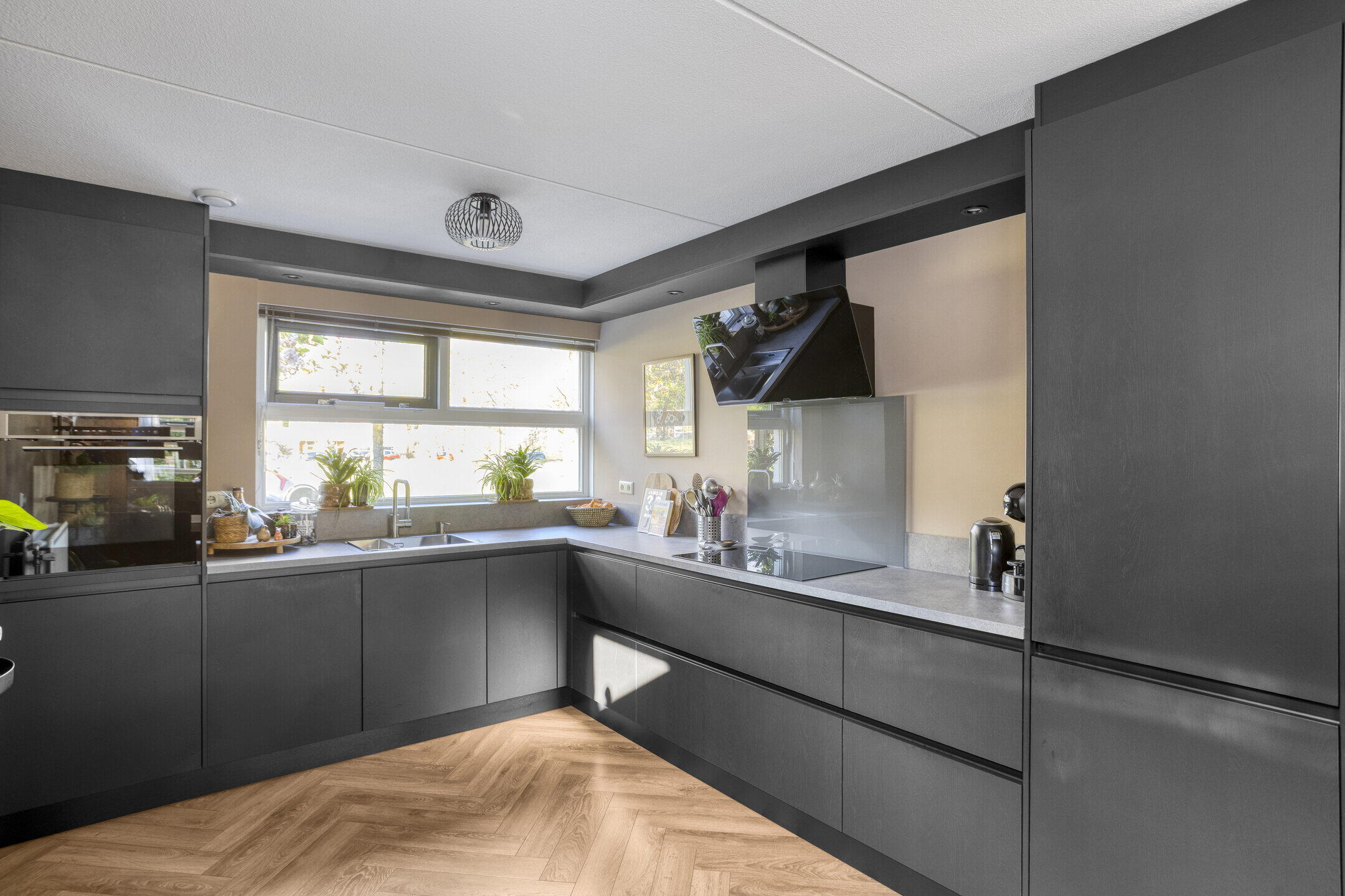 De uitgebouwde begane grond is in 2025 voorzien van een visgraat laminaatvloer, wat direct zorgt voor een warme uitstraling. Aan de voorzijde bevindt zich de splinternieuwe, matzwarte keuken (2025), compleet uitgerust met hoogwaardige inbouwapparatuur zoals een inductiekookplaat, afzuigkap, combimagnetron/oven, koelkast, vriezer en vaatwasser.