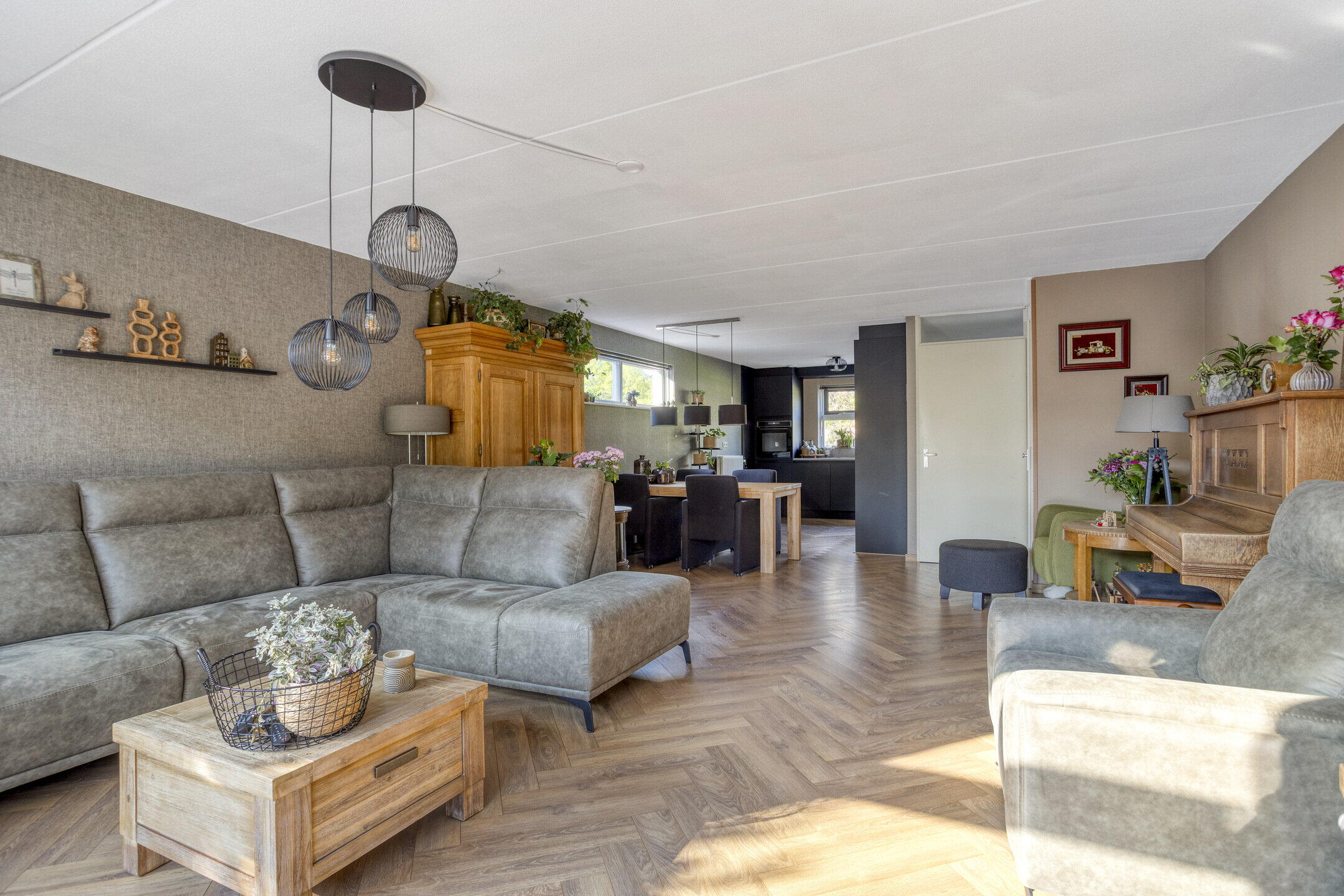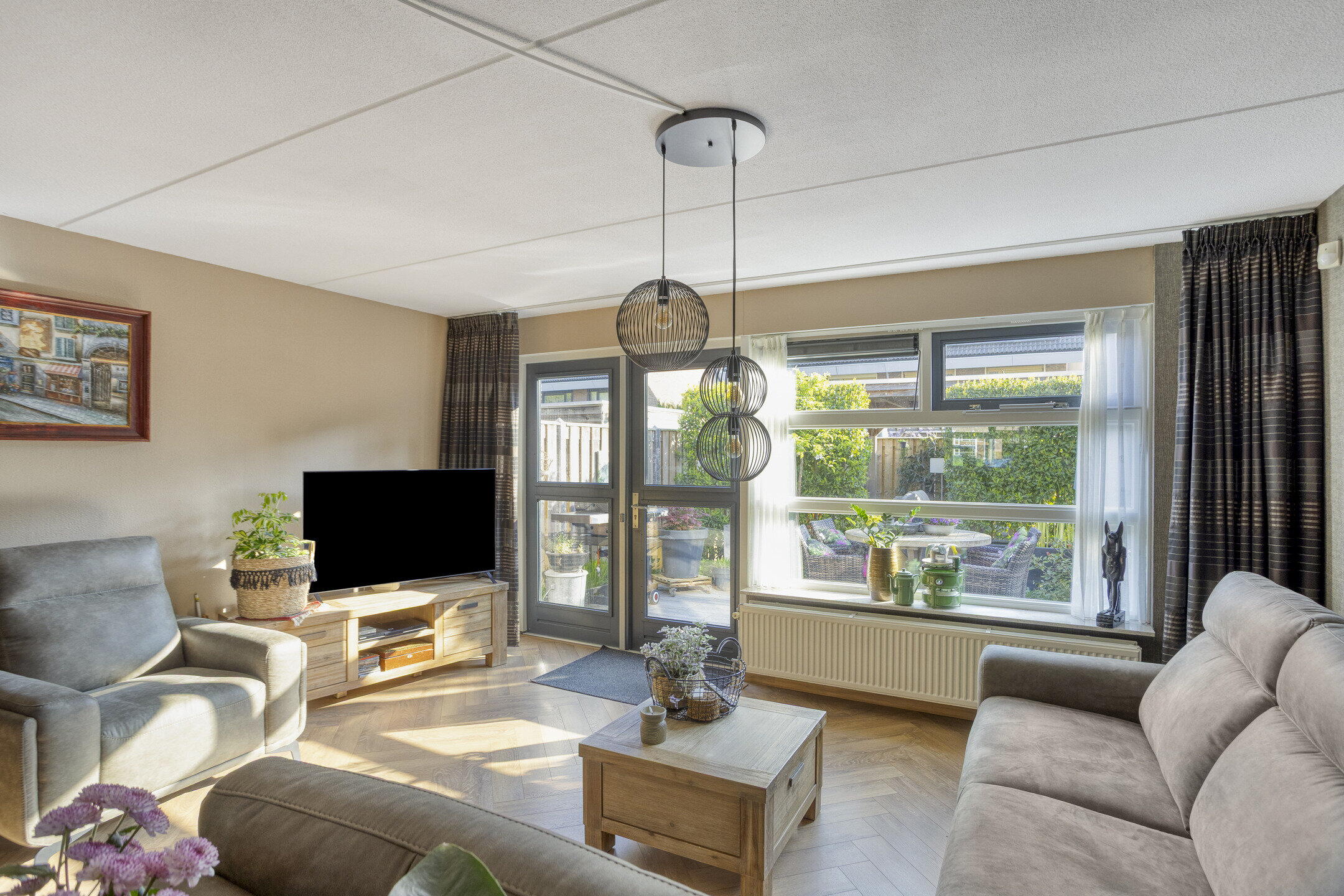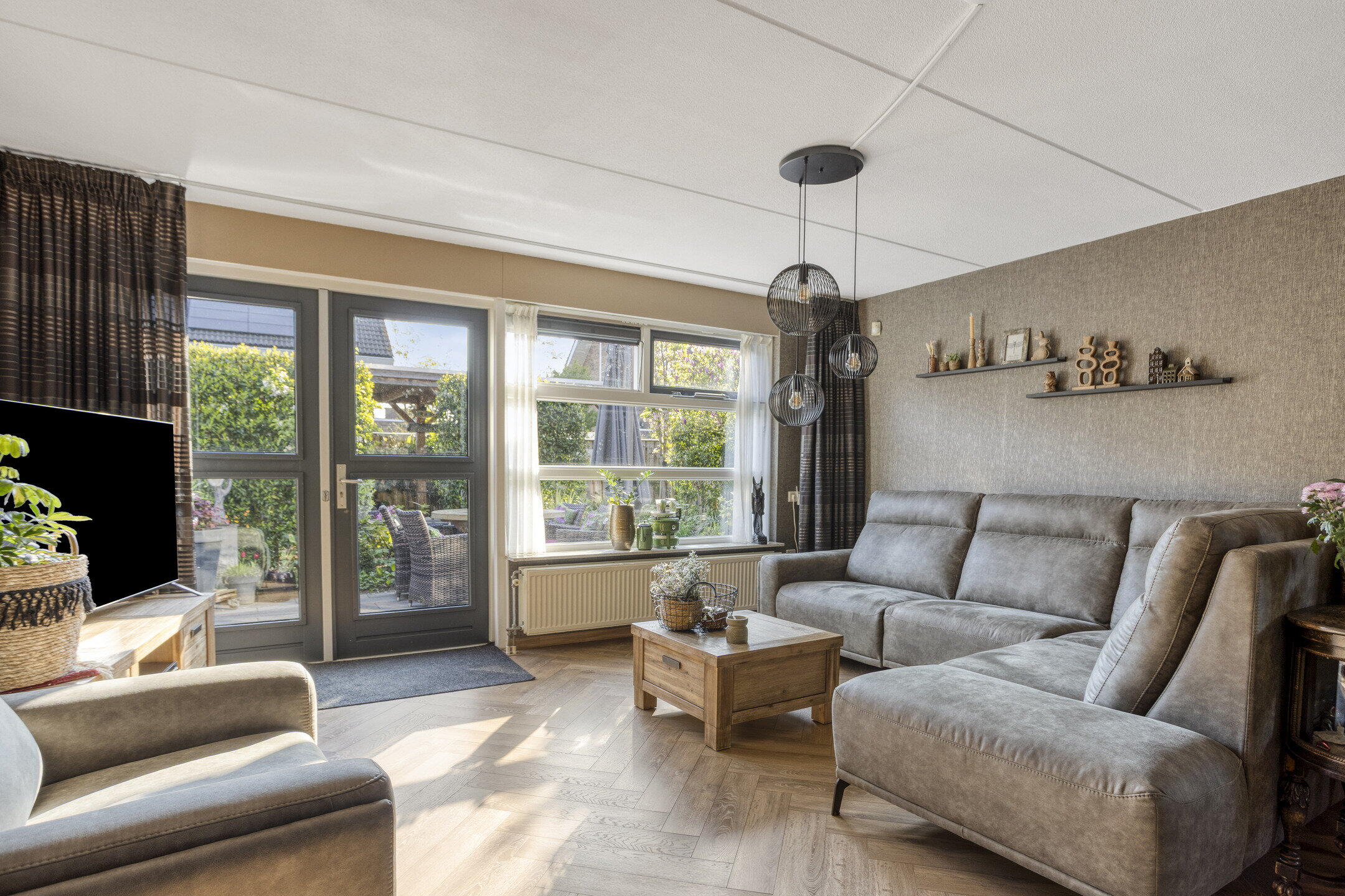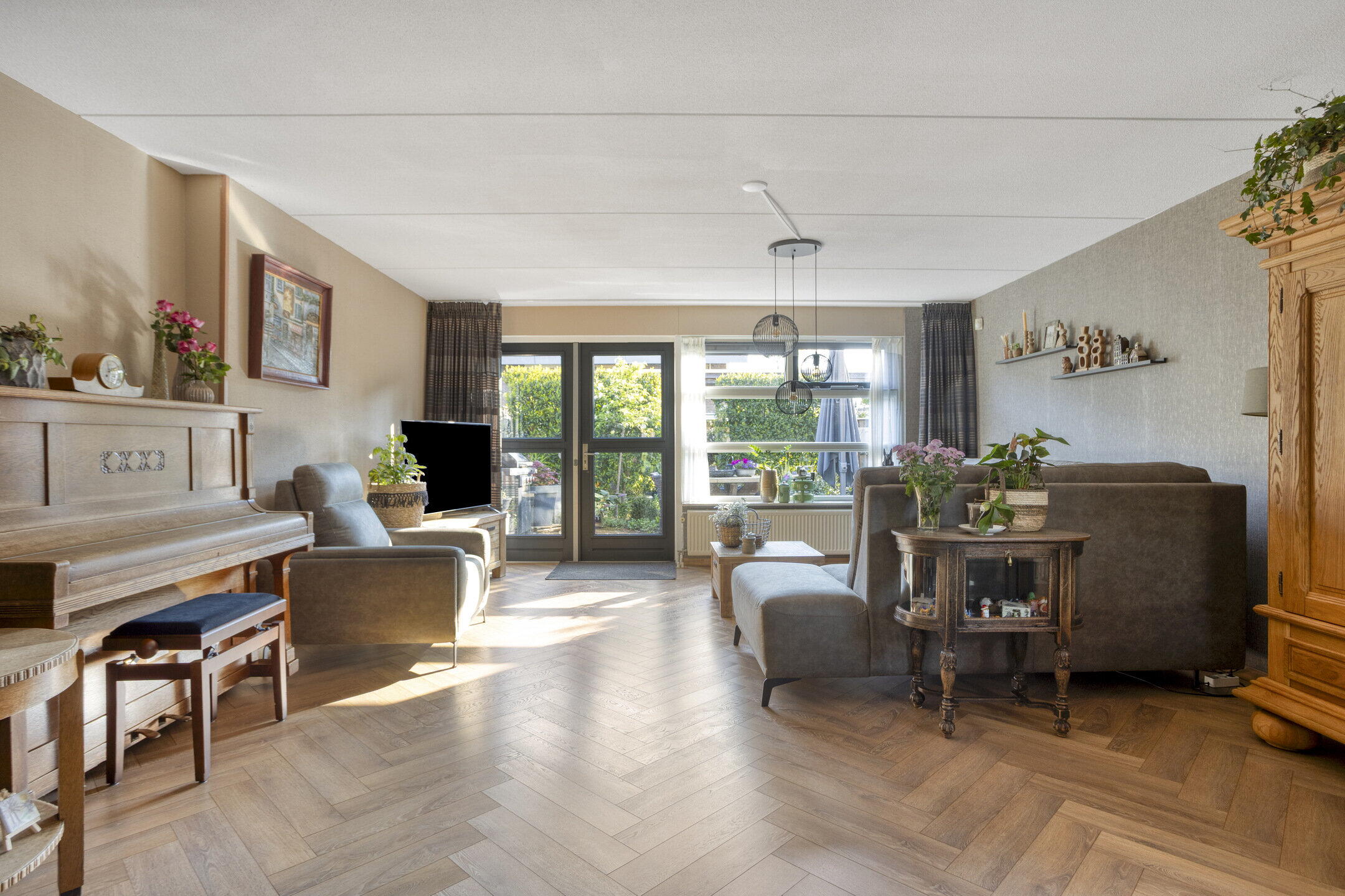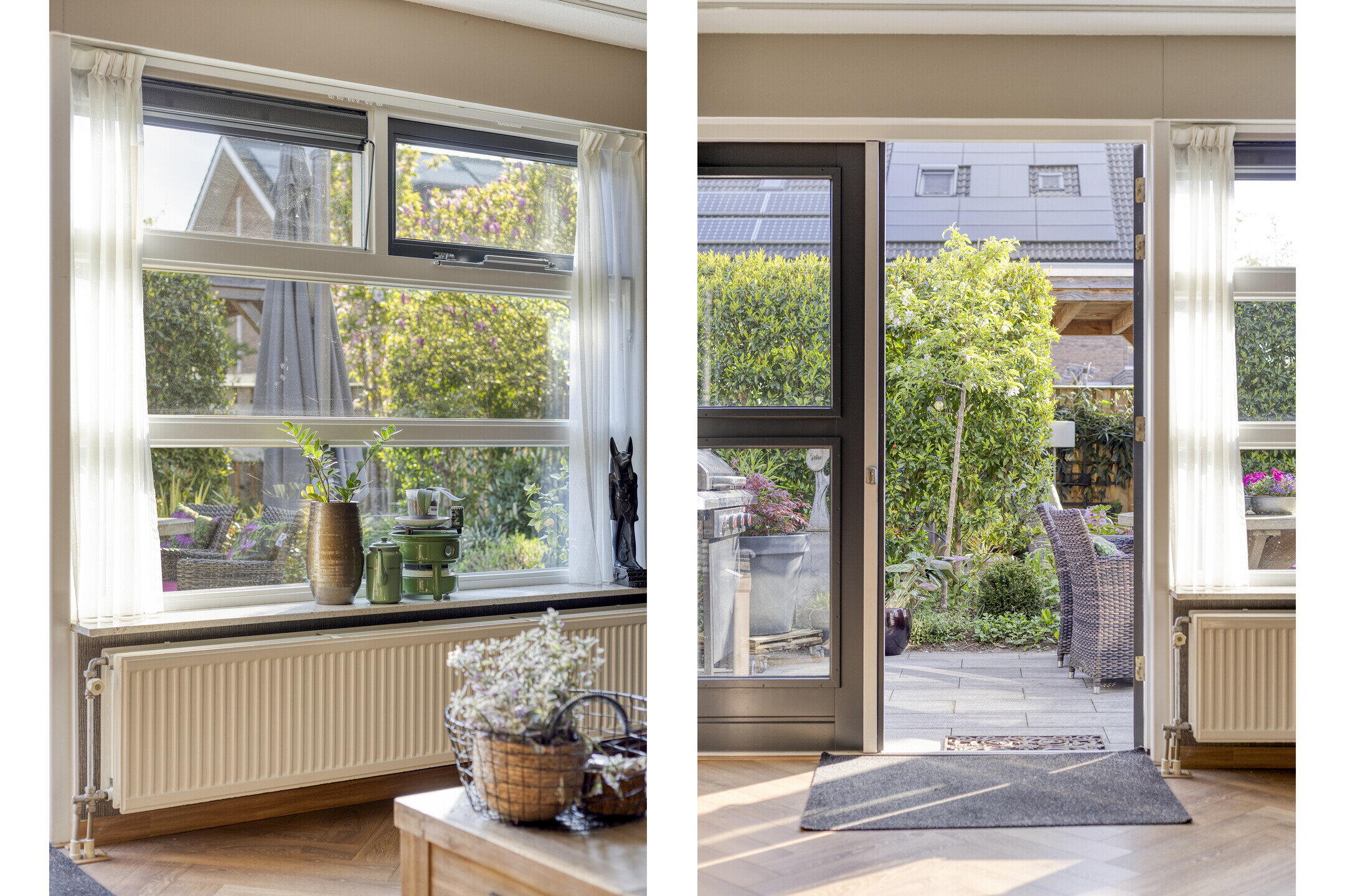 De lichte woonkamer aan de achterzijde biedt volop leefruimte en staat in directe verbinding met de tuin. Via de openslaande deuren stap je zo de achtertuin in, wat zorgt voor een fijne overgang tussen binnen en buiten.