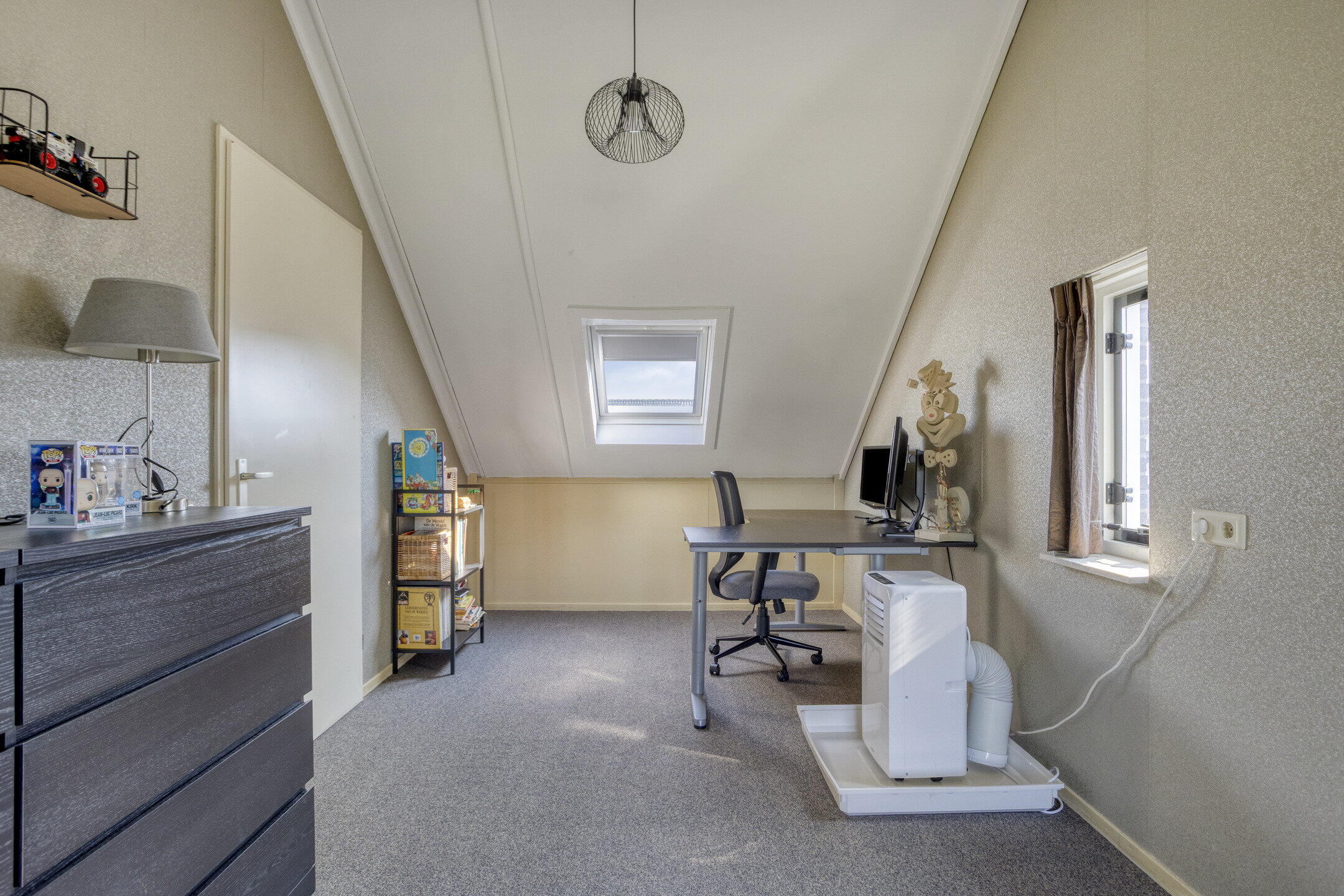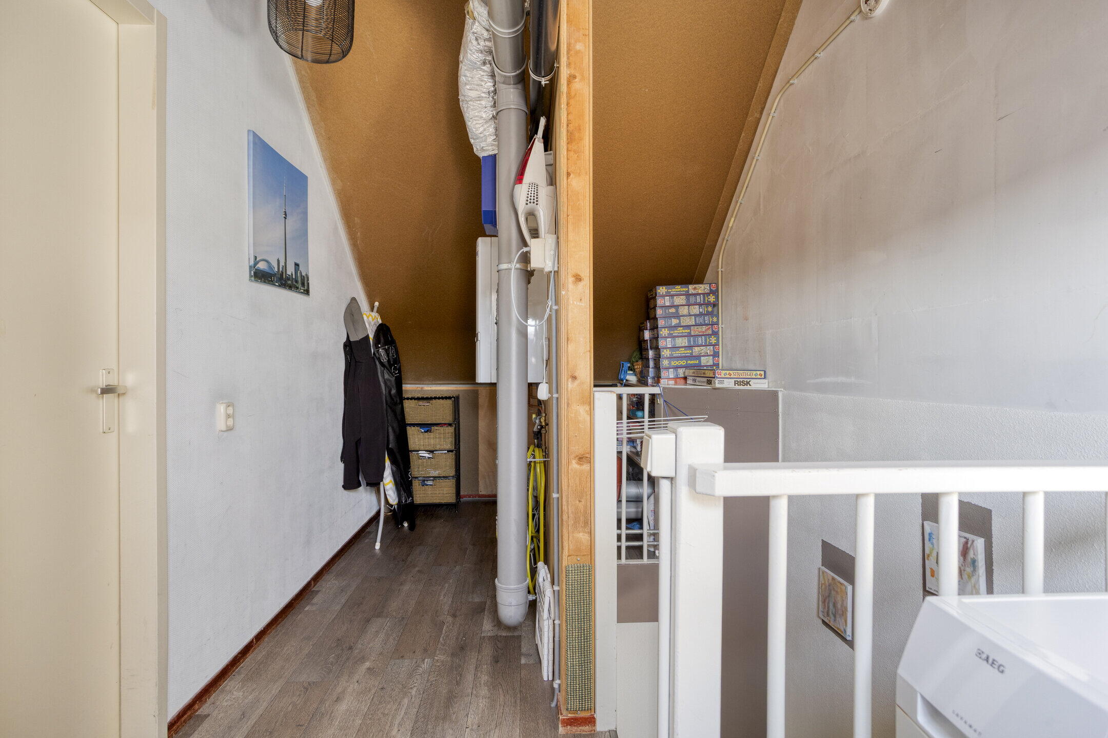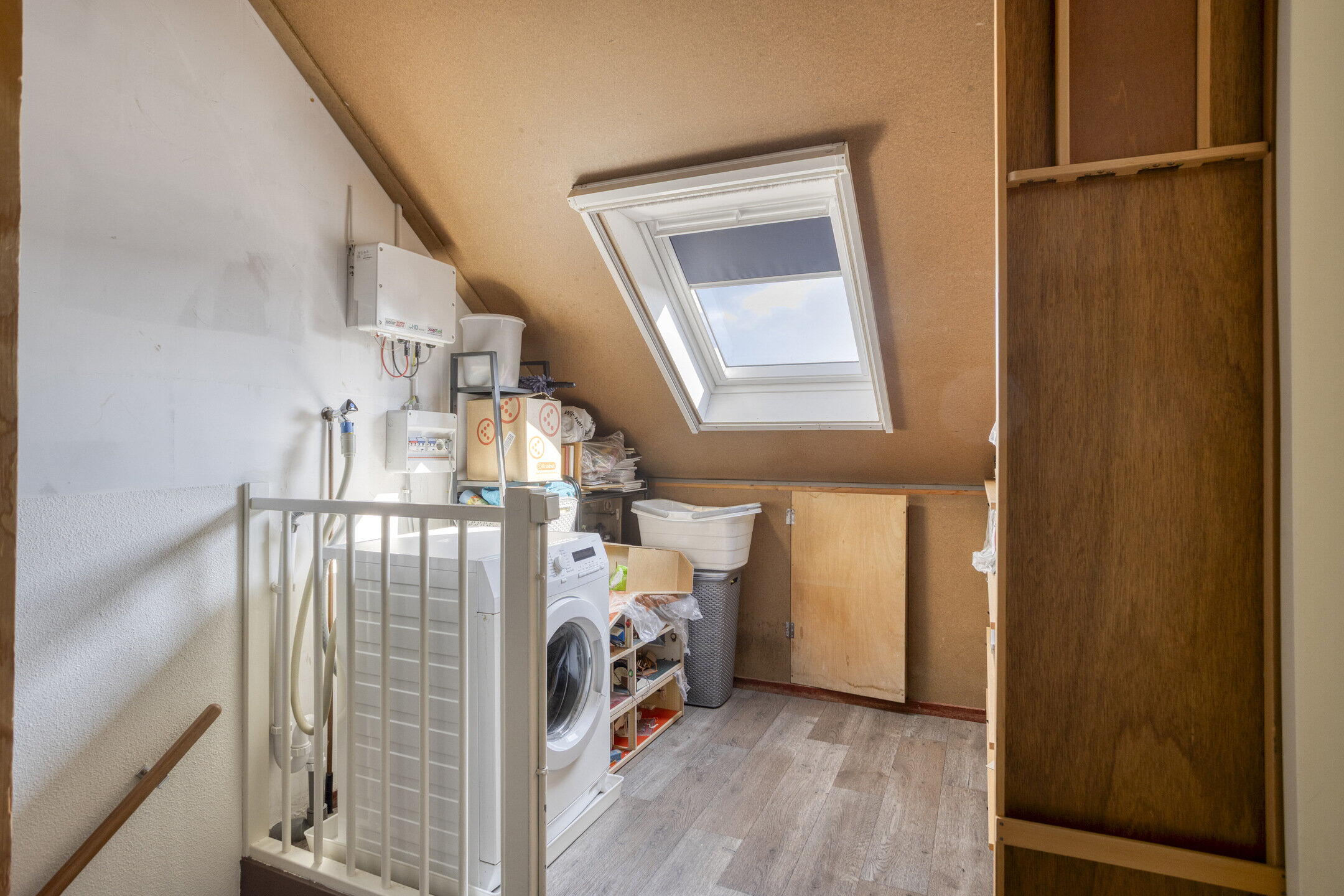Via een vaste trap bereik je de tweede verdieping. De voorzolder beschikt over een Velux dakraam, aansluitingen voor wasmachine en droger, de cv-opstelling en praktische bergruimte. Daarnaast is er een derde, ruime slaapkamer met zowel een zijraam als een Velux dakraam aan de achterzijde.