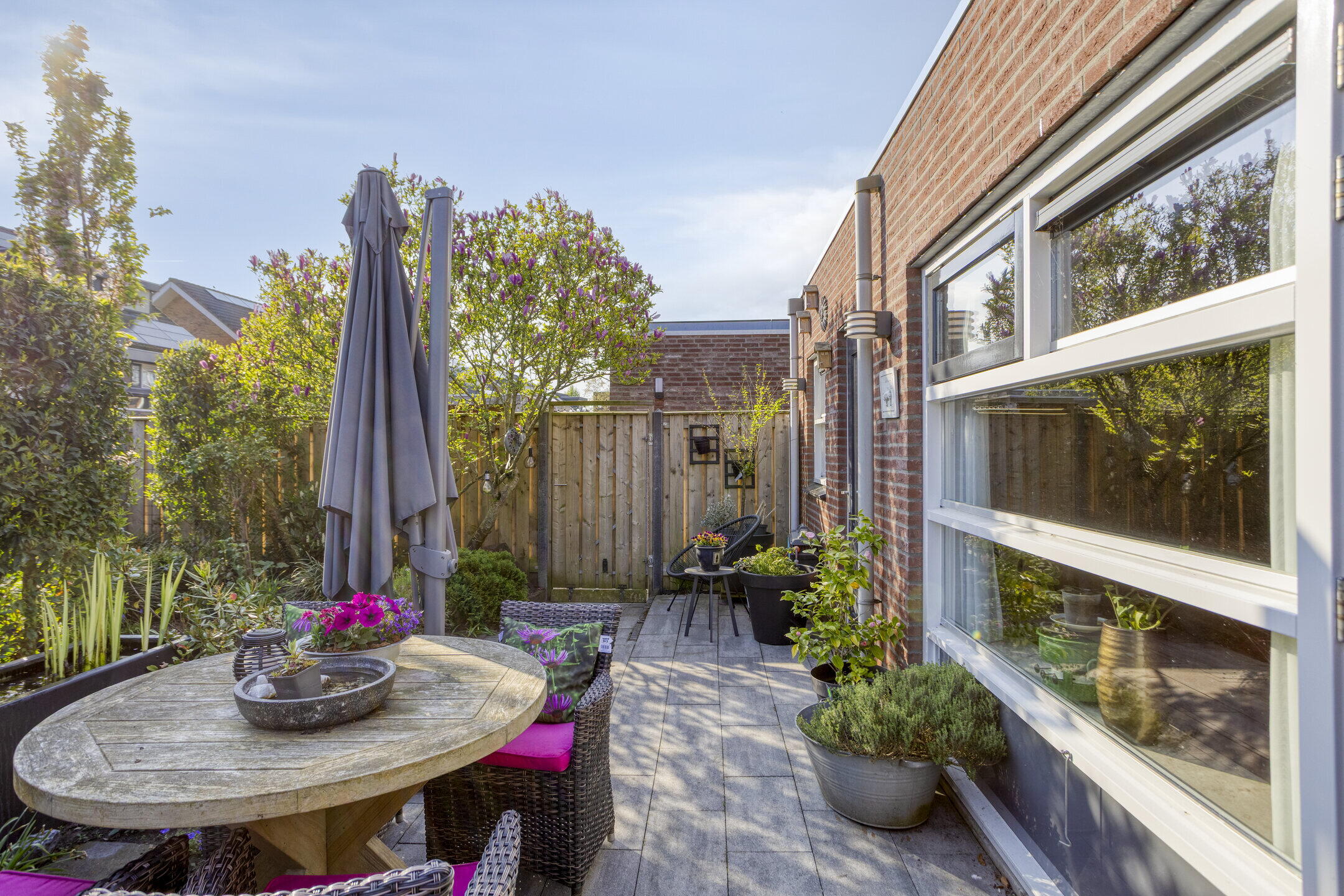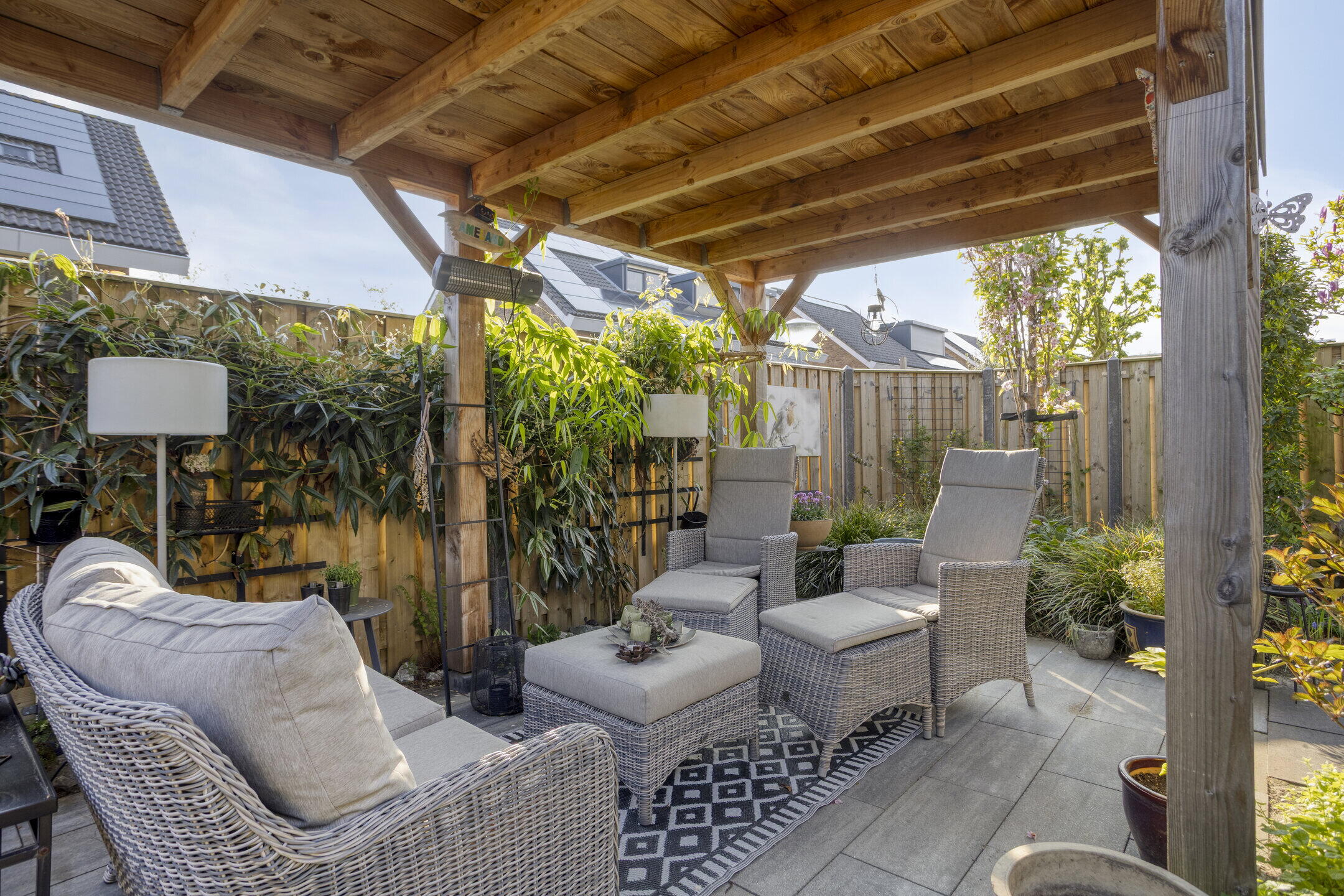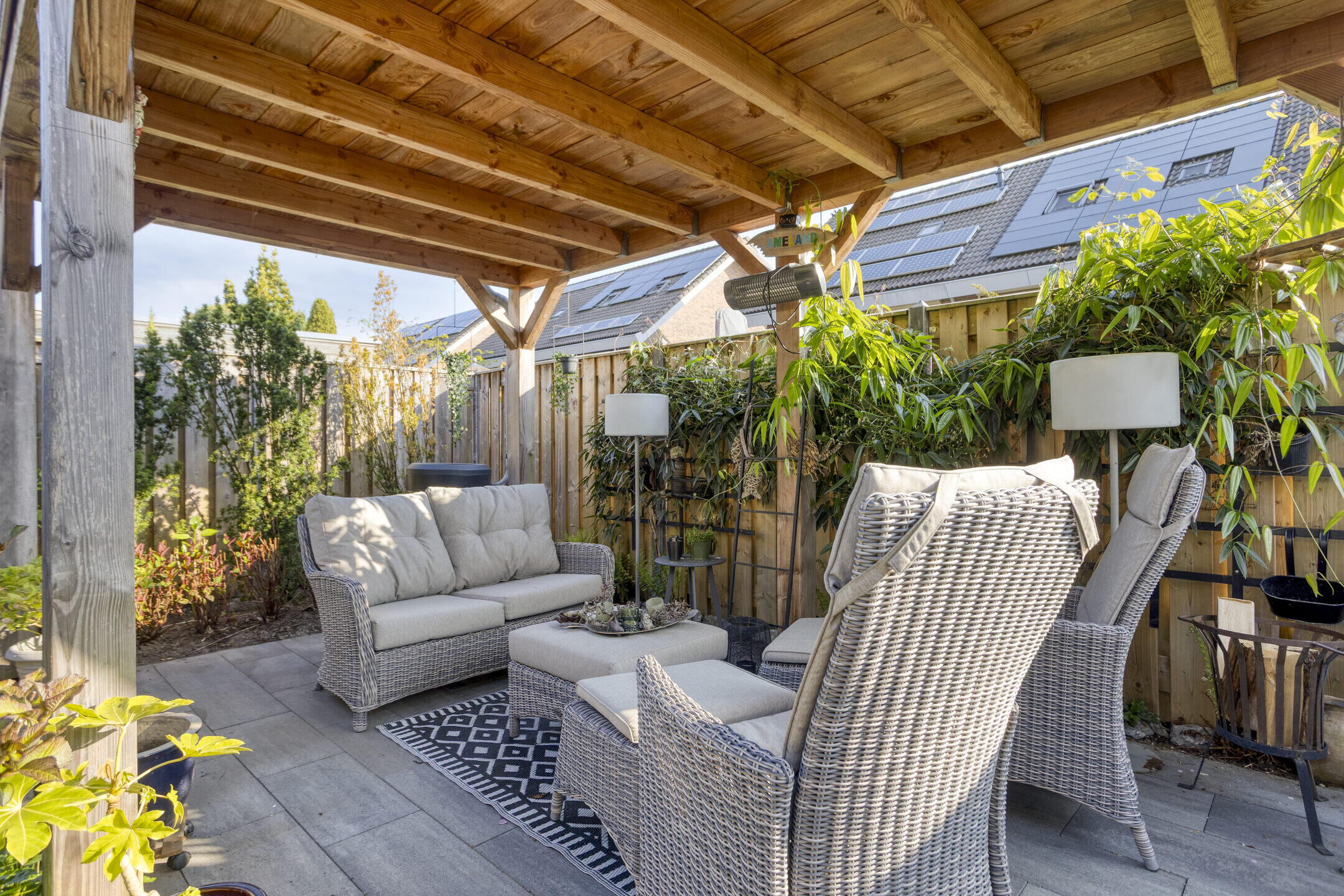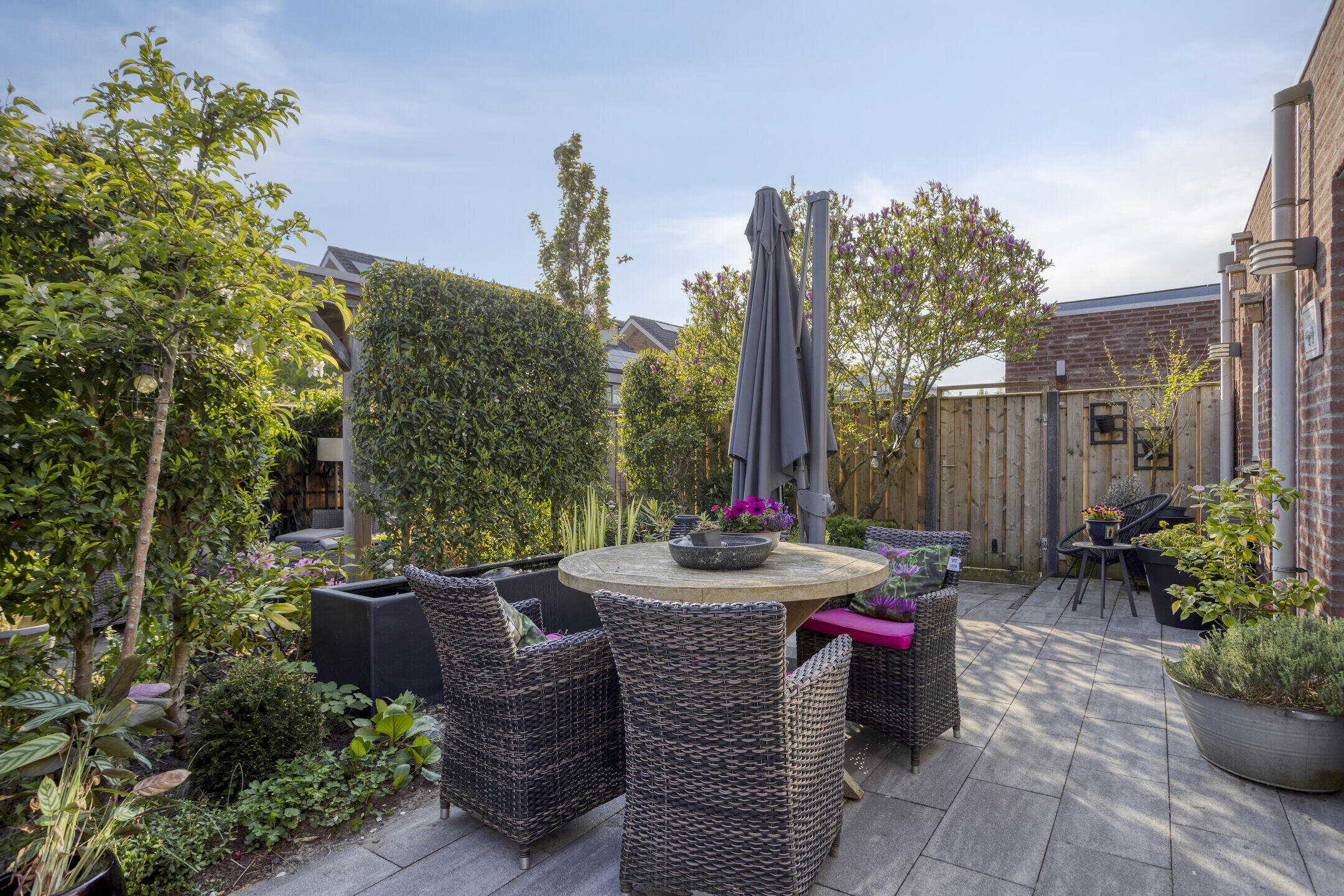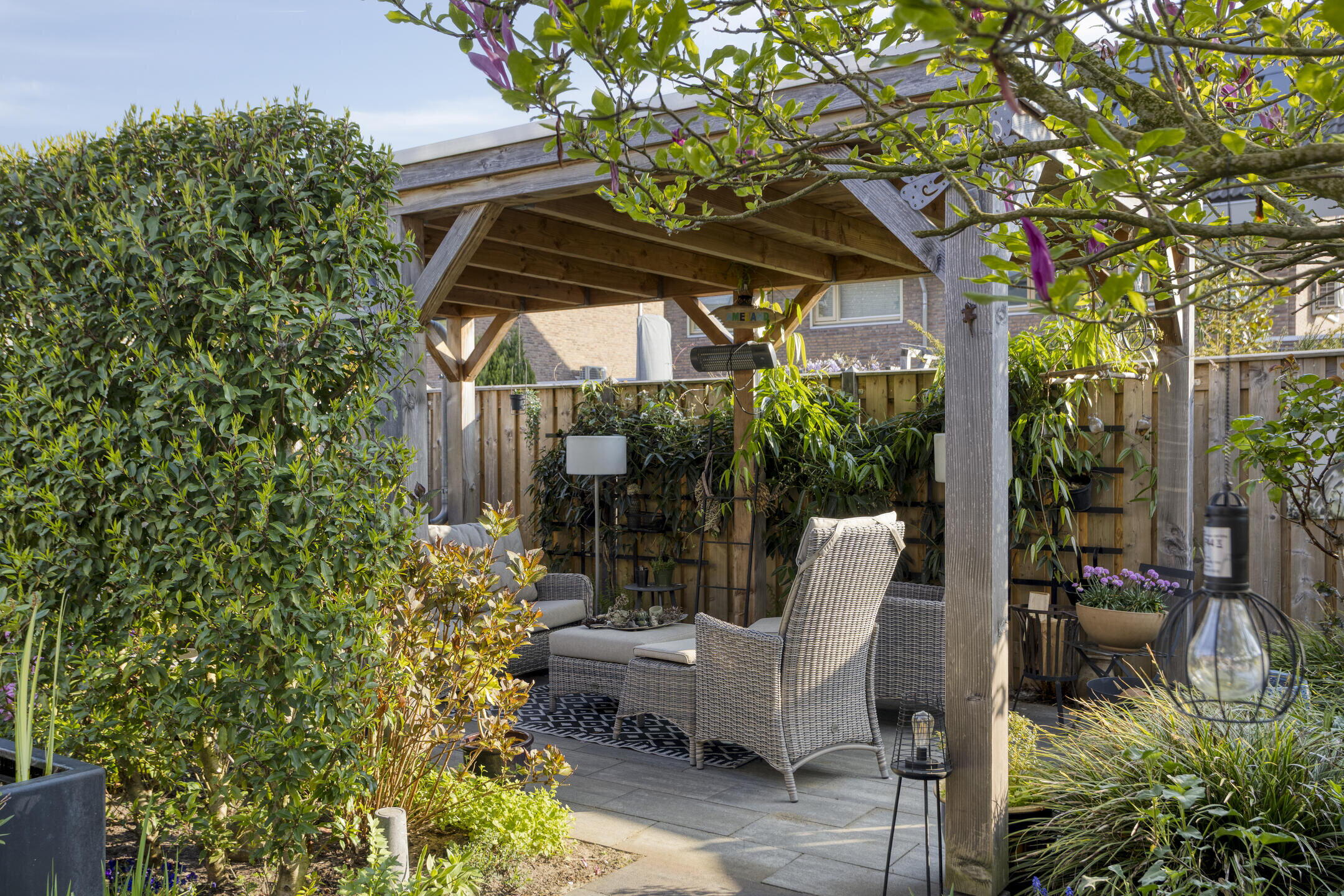 Buiten geniet je van een verzorgde achtertuin met overkapping, ideaal om het hele jaar door buiten te zitten. Aan de zijkant bevindt zich een charmante patiotuin.